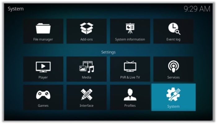 - Navigate to the Settings menu in Kodi.